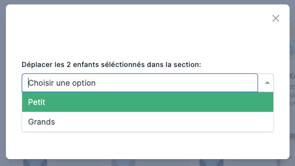 L’option “Déplacer dans une section” fait apparaître une fenêtre dans laquelle vous pourrez choisir une section dans la liste déroulante et ensuite valider. Les enfants seront alors instantanément déplacés dans la section choisie.