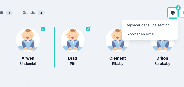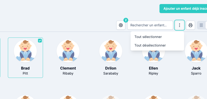 Il est possible d’ajouter les enfants à une sélection multiple. Lorsqu’au moins un enfant est sélectionné, un menu apparaît.