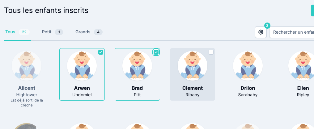 Pour sélectionner un enfant, passez la souris sur le cadre et cliquez sur la case en haut à droite. Il est également possible de sélectionner tous les enfants d’un coup en cliquant sur l’option “Tout sélectionner”