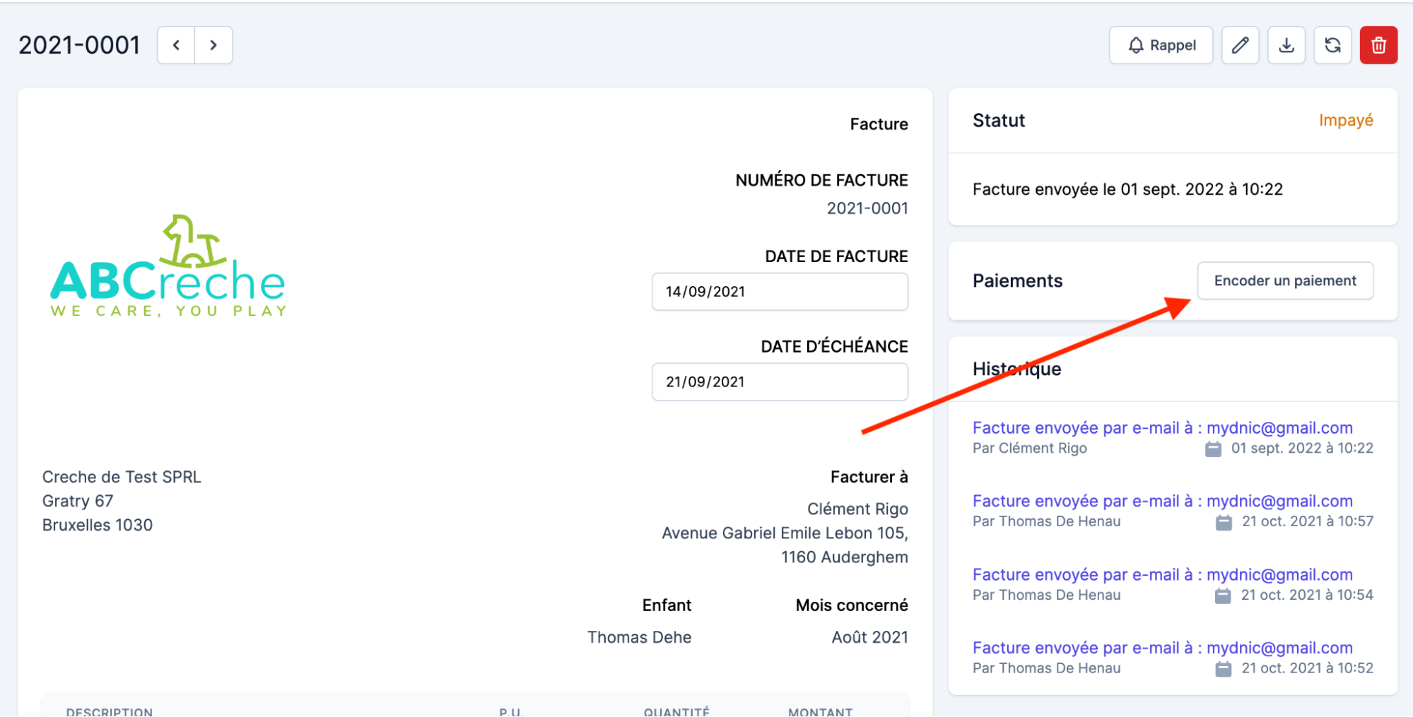 Rendez vous dans la facture et cliquez “Encoder un paiement”