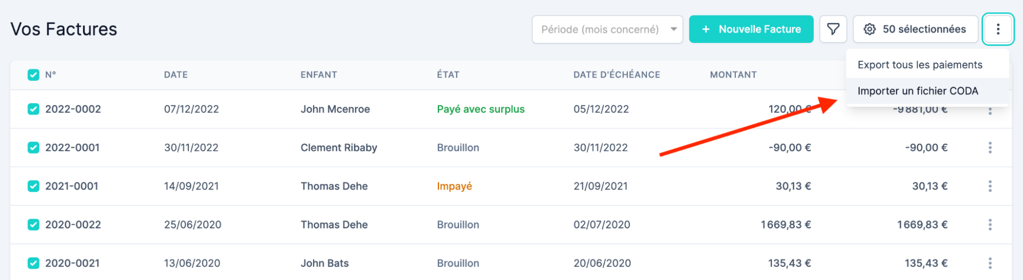 Lorsqu’une facture est payée par le parent, il est recommandé d’encoder les paiements reçus dans le logiciel. C’est particulièrement important pour la génération des Attestations Fiscales.