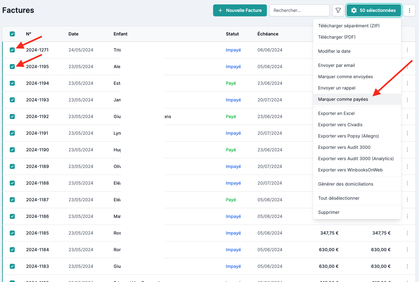 Dans la liste des factures, sélectionnez celles que vous souhaitez marquer comme payées et cliquez sur “Marquer comme payées”.
