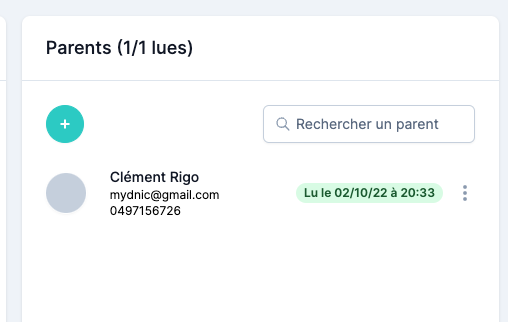 Une fois la communication email envoyée, elle s’ajoute dans la liste et vous pouvez cliquer dessus pour en afficher les détails. A droite se trouve la liste des parents à qui l’email a été envoyé et le statut de réception (Non envoyé, Non lu, Lu et l’heure de lecture).