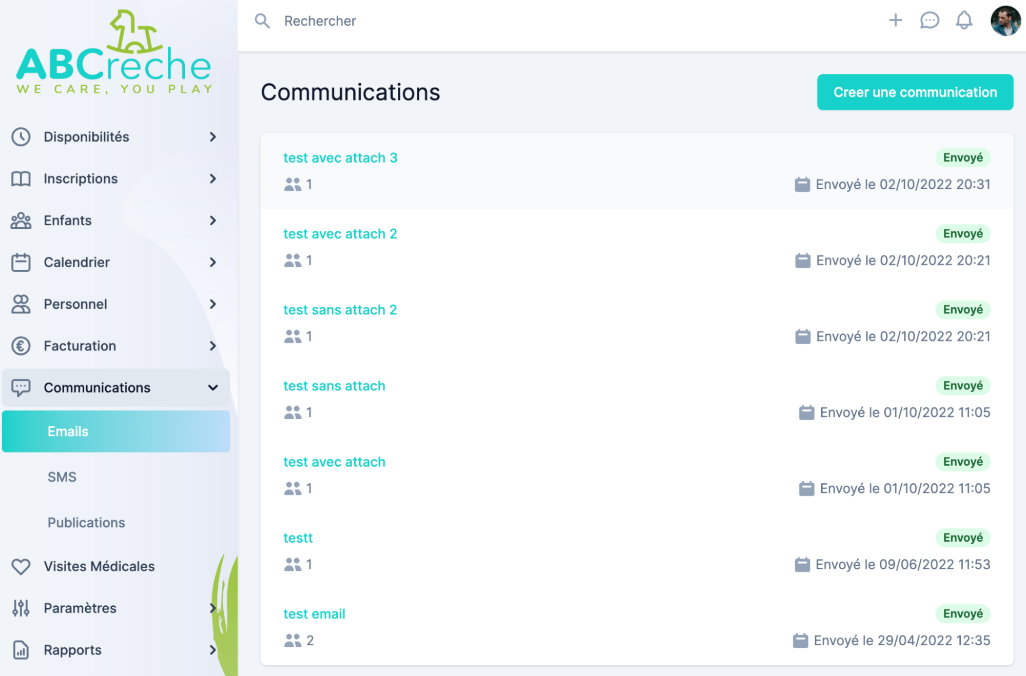 Ces emails sont envoyés à partir du système mail de ABCreche, donc vous ne verrez pas les emails envoyés dans votre boite d’envoi de votre client mail.